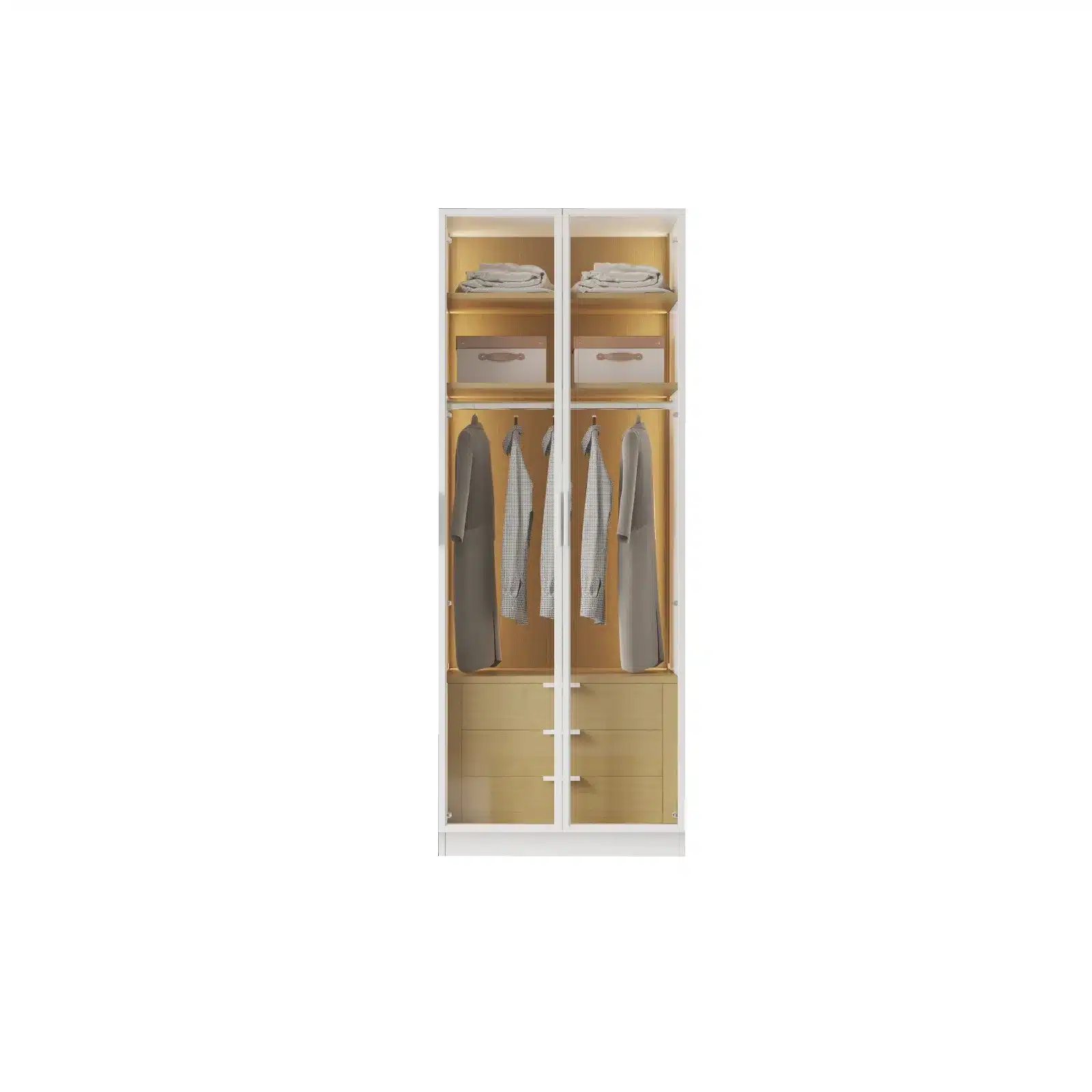 החלוקה הפנימית של ארון הבגדים תוכננה בקפידה לניצול מקסימלי של כל סנטימטר. בחלק העליון תמצאו מדפים רחבים לאחסון מצעים, שמיכות או פריטים עונתיים. באזור המרכזי ממוקם מוט תלייה נוח לחולצות, שמלות, חליפות ומעילים. בחלק התחתון משולבות מגירות מרווחות המצוידות במנגנון טריקה שקטה, מושלמות לאחסון הלבשה תחתונה, גרביים ואביזרים קטנים. תאורת ה-LED המובנית נדלקת באופן אוטומטי עם פתיחת הדלתות ומאירה את כל תכולת הארון באור אחיד ונעים.