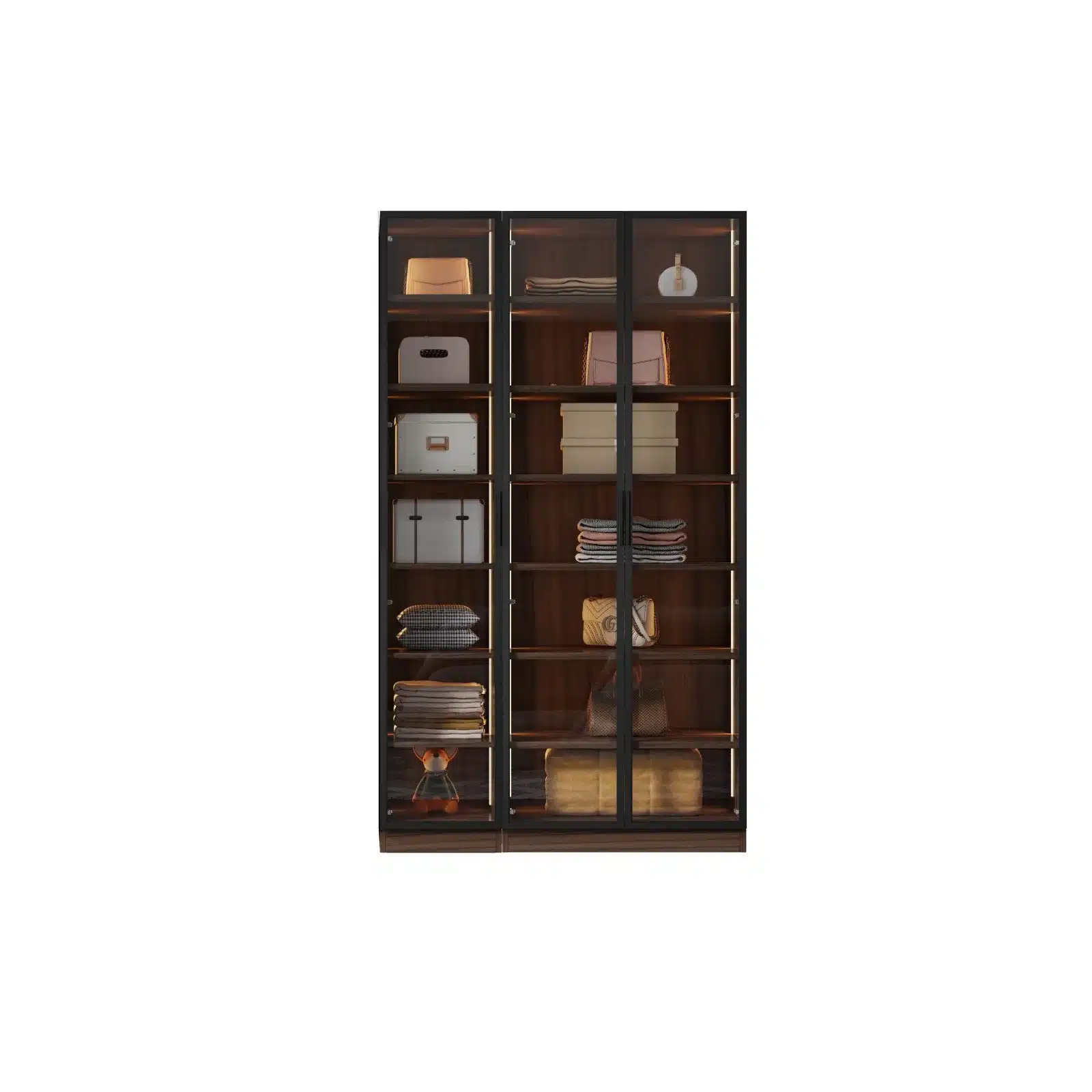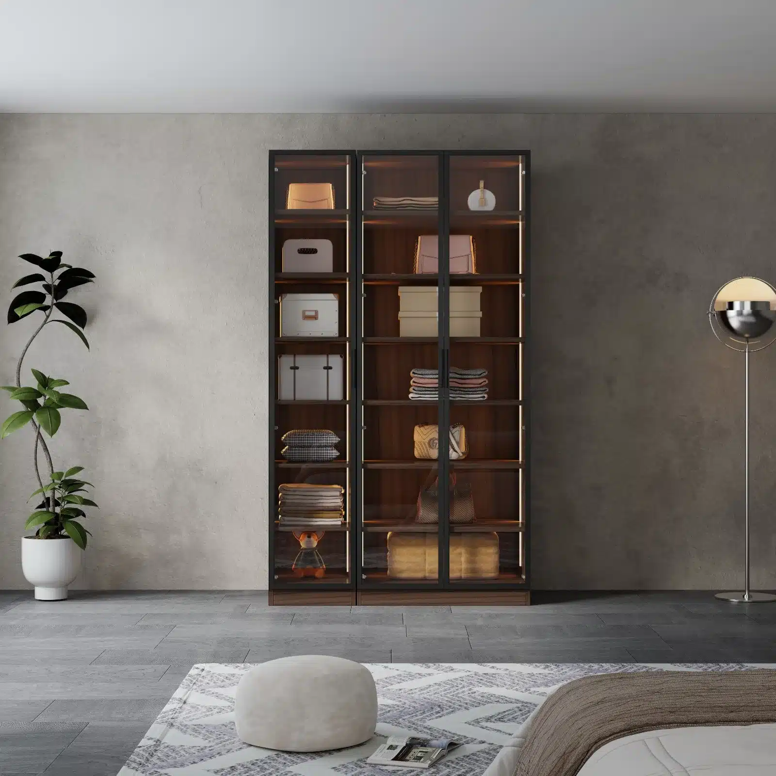 ארון הבגדים עם דלתות הזכוכית זמין בגימור חום כהה יוקרתי המתאים לכל סגנון עיצוב מודרני: