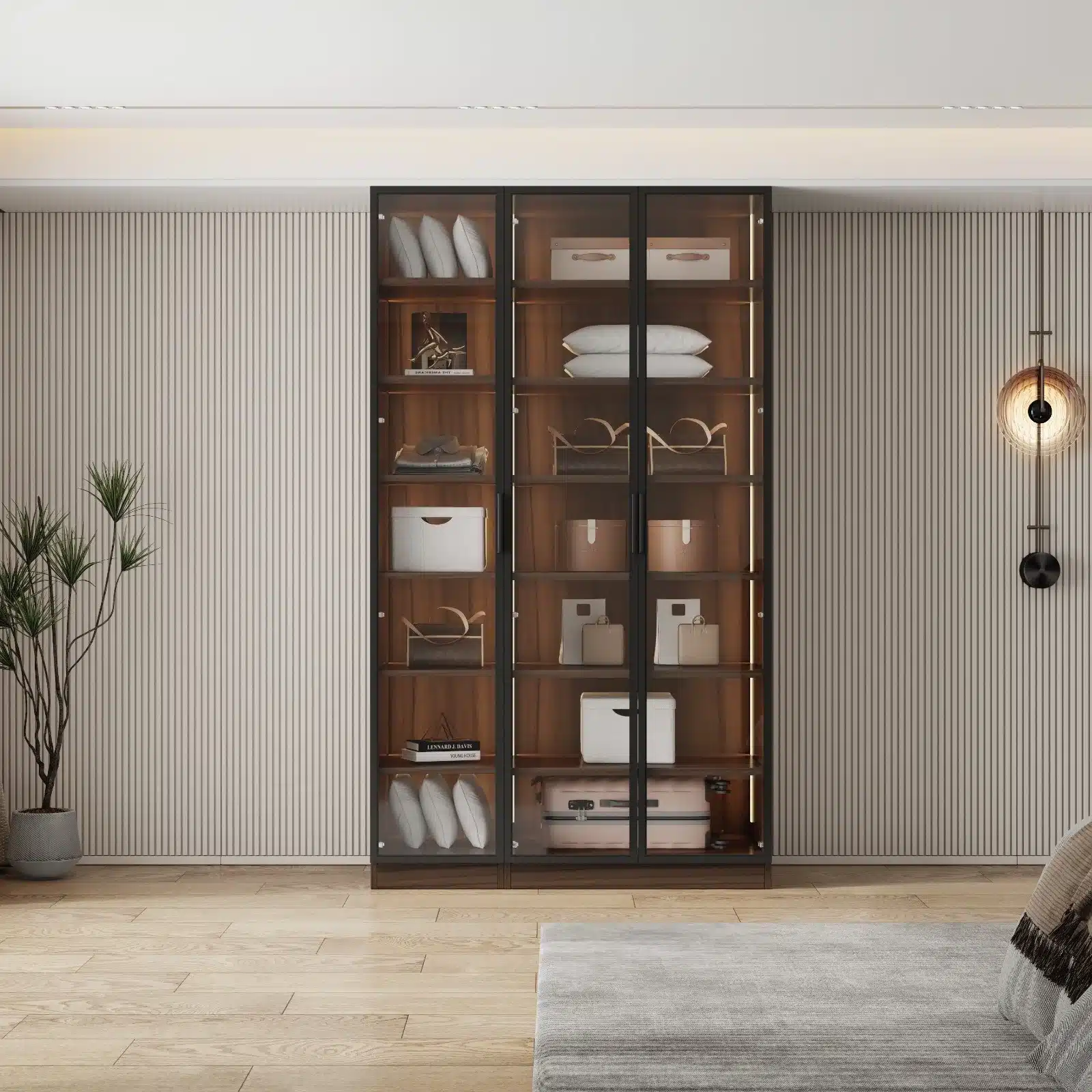 - חדר שינה: פתרון אחסון מרכזי שמשלב יוקרה ופונקציונליות, מעניק תחושת מרחב בזכות דלתות הזכוכית השקופות