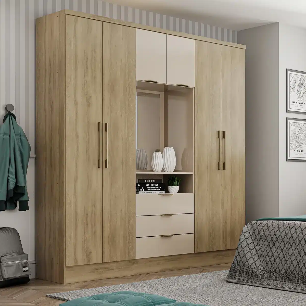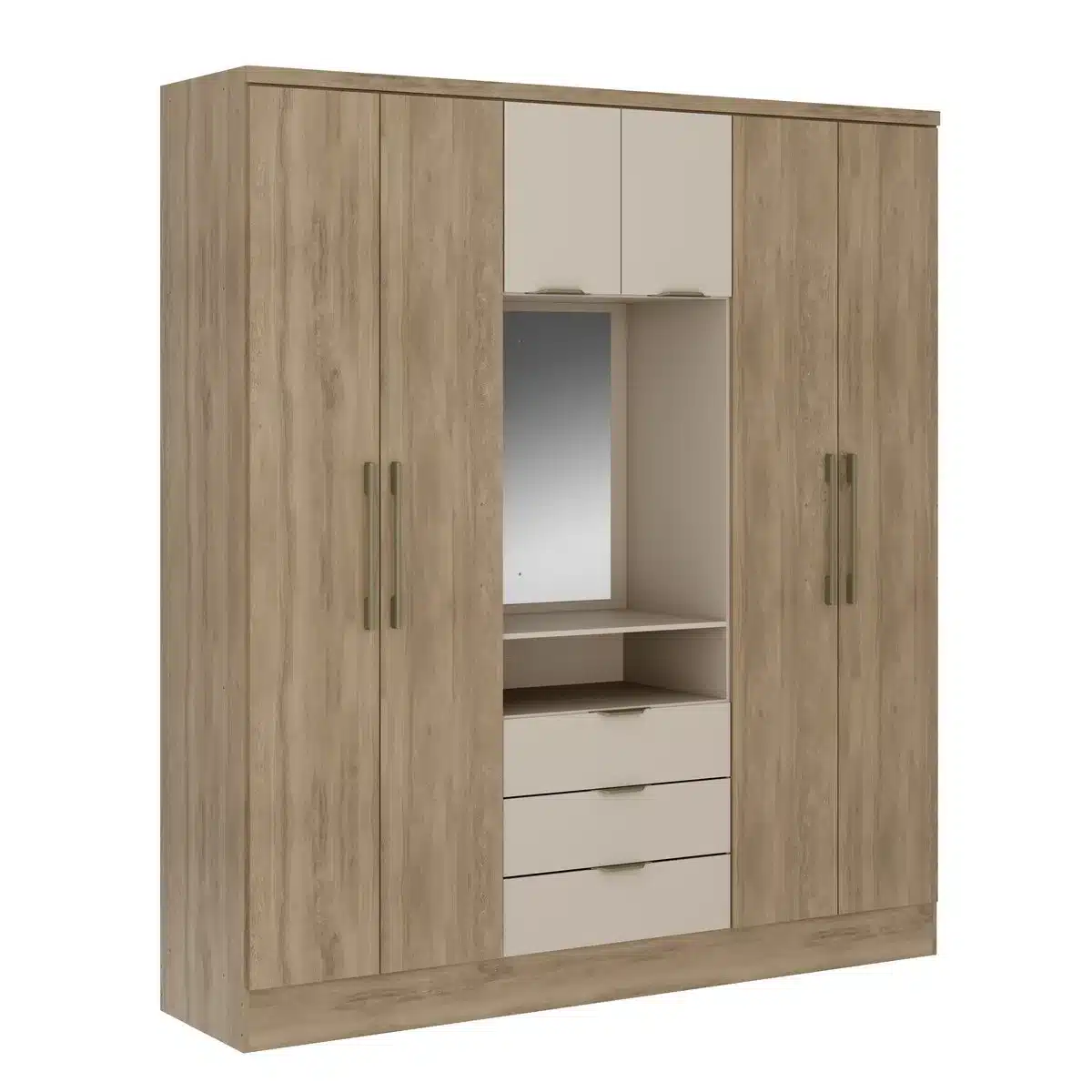העיצוב המודרני והפרקטי של ארון הבגדים משלב בין אסתטיקה לפונקציונליות. המבנה הרחב והגבוה כולל 4 דלתות חזקות עם ידיות זהב אלגנטיות, חלוקה פנימית מתוכננת היטב הכוללת תאי תלייה מרווחים לבגדים ארוכים, מדפים רחבים לקיפולים מסודרים, ו-3 מגירות עמוקות במרכז הארון. השילוב הייחודי של אורן טבעי ובז' בהיר יוצר מראה חם ומזמין המתאים לכל סגנון עיצוב. הידיות הזהב מוסיפות נופך של אלגנטיות ומודרניות. המראה המובנית בגודל מלא מהווה יתרון משמעותי – היא חוסכת את הצורך במראה נפרדת בחדר ומעניקה נוחות מקסימלית בבחירת הלבוש.
