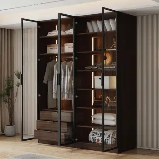 ארון בגדים 4 דלתות זכוכית זמין בגוון חום כהה יוקרתי: