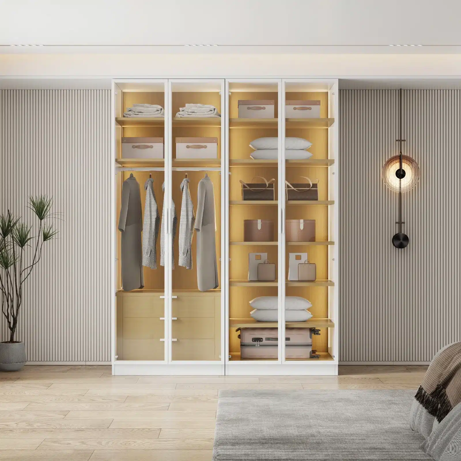ארון בגדים 4 דלתות זכוכית עם תאורת LED זמין בשילוב צבעים אלגנטי המתאים לכל סגנון עיצוב מודרני:
