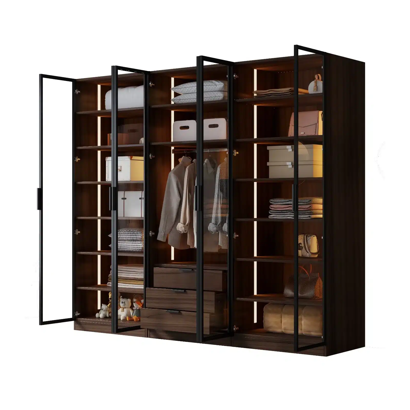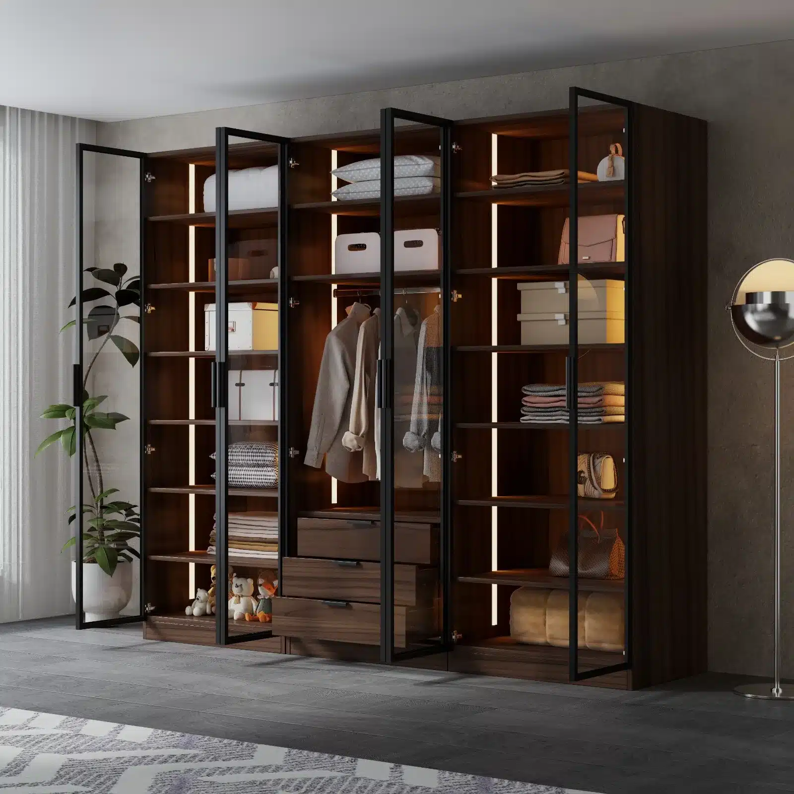 ארון בגדים 6 דלתות זכוכית עם תאורת LED – פתרון אחסון יוקרתי לחדר השינה
