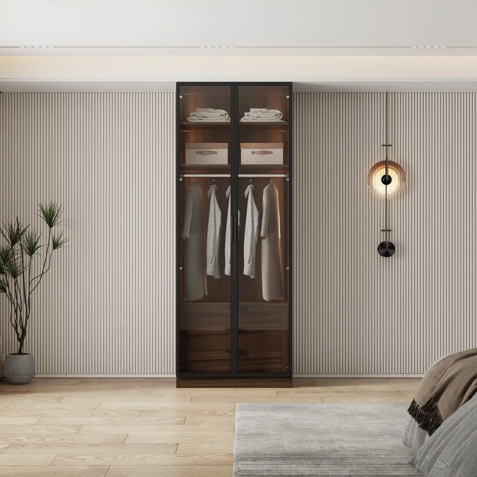 עיצוב אלגנטי: דלתות זכוכית מחוסמת עם מסגרת אלומיניום איכותית, גימור חום כהה יוקרתי ותאורת LED אוטומטית שמאירה את תכולת הארון.
