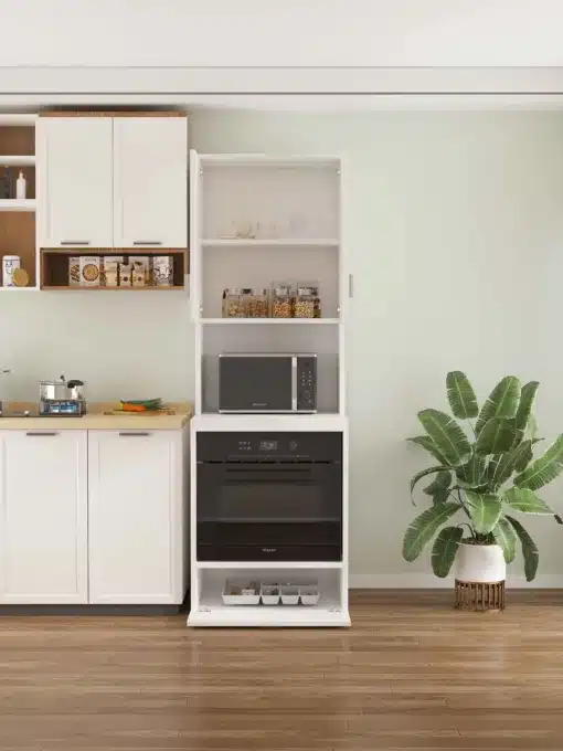 ✓ פתרון אחסון מקסימלי – הארון מציע 4 אזורי אחסון שונים: ארון עליון עם שתי דלתות ומדף, מדף מרכזי למיקרוגל, תא לתנור בילד אין, ומגירה תחתונה. זהו פתרון שמאפשר לנצל כל סנטימטר בצורה חכמה ויעילה.
