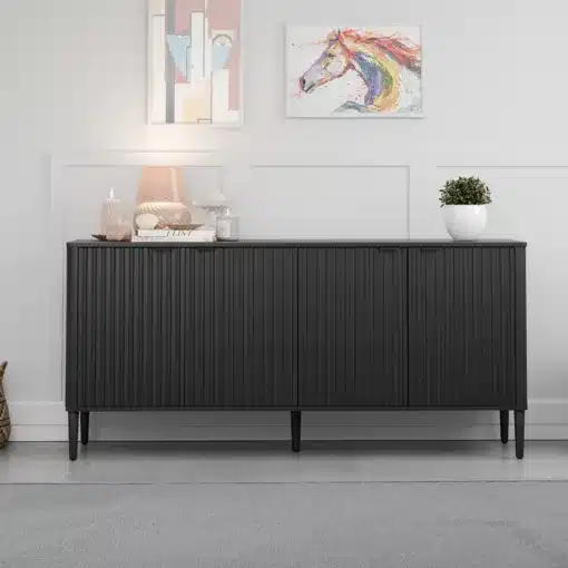 הקומודה כוללת ארבע דלתות רחבות המסתירות שמונה תאי אחסון גדולים עם מדפים מתכווננים המאפשרים התאמה מושלמת לכל סוג פריט – החל מכלי בית, דרך ספרים וציוד משרדי ועד בגדים ואביזרי עיצוב. המנגנון הפשוט והאיכותי מבטיח פתיחה וסגירה חלקה לאורך זמן.
