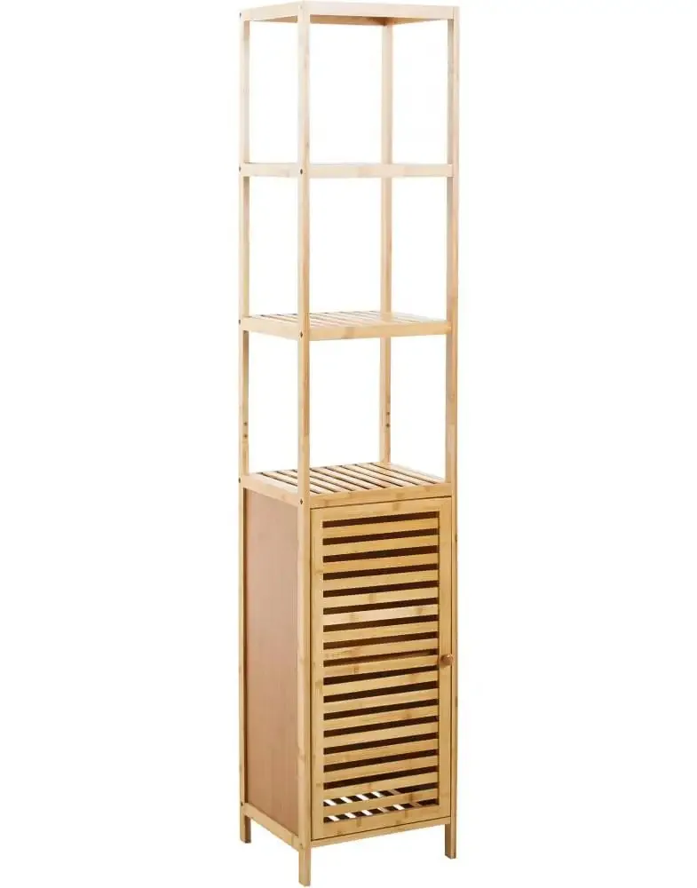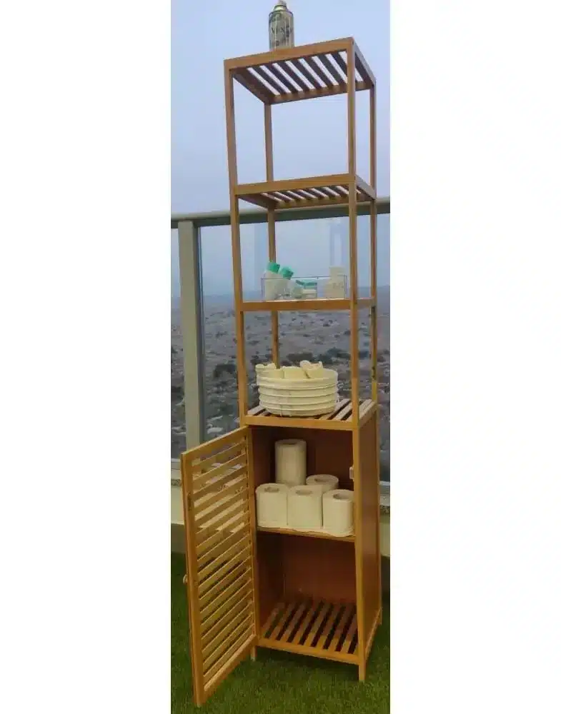 ארון שירות גבוה מבמבוק המשלב עיצוב מודרני ונקי עם עמידות יוצאת דופן ללחות. פתרון אידיאלי המשלב שלוש קומות של מדפים פתוחים יחד עם יחידת אחסון סגורה לשמירה על סדר וארגון.