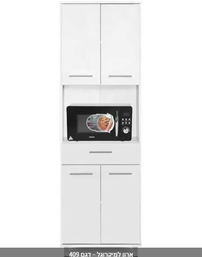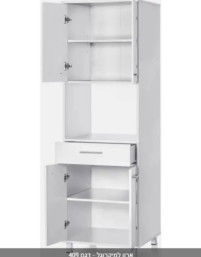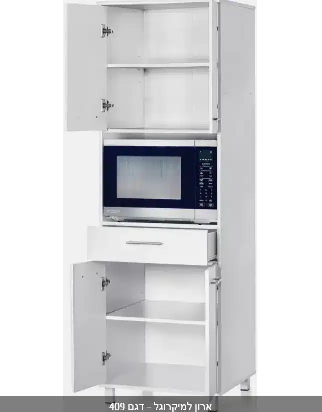 הארון תוכנן בדגש על חוויית שימוש נוחה ונגישה. התא המרכזי הפתוח ממוקם בגובה אידיאלי לשימוש במיקרוגל או בתנור קטן, בעוד המגירה הנשלפת מאפשרת גישה מהירה לסכו"ם, מגבות מטבח או אביזרים קטנים. ארבע הדלתות מסתירות מדפים פנימיים מרווחים השומרים על המטבח שלכם מסודר ואסתטי.