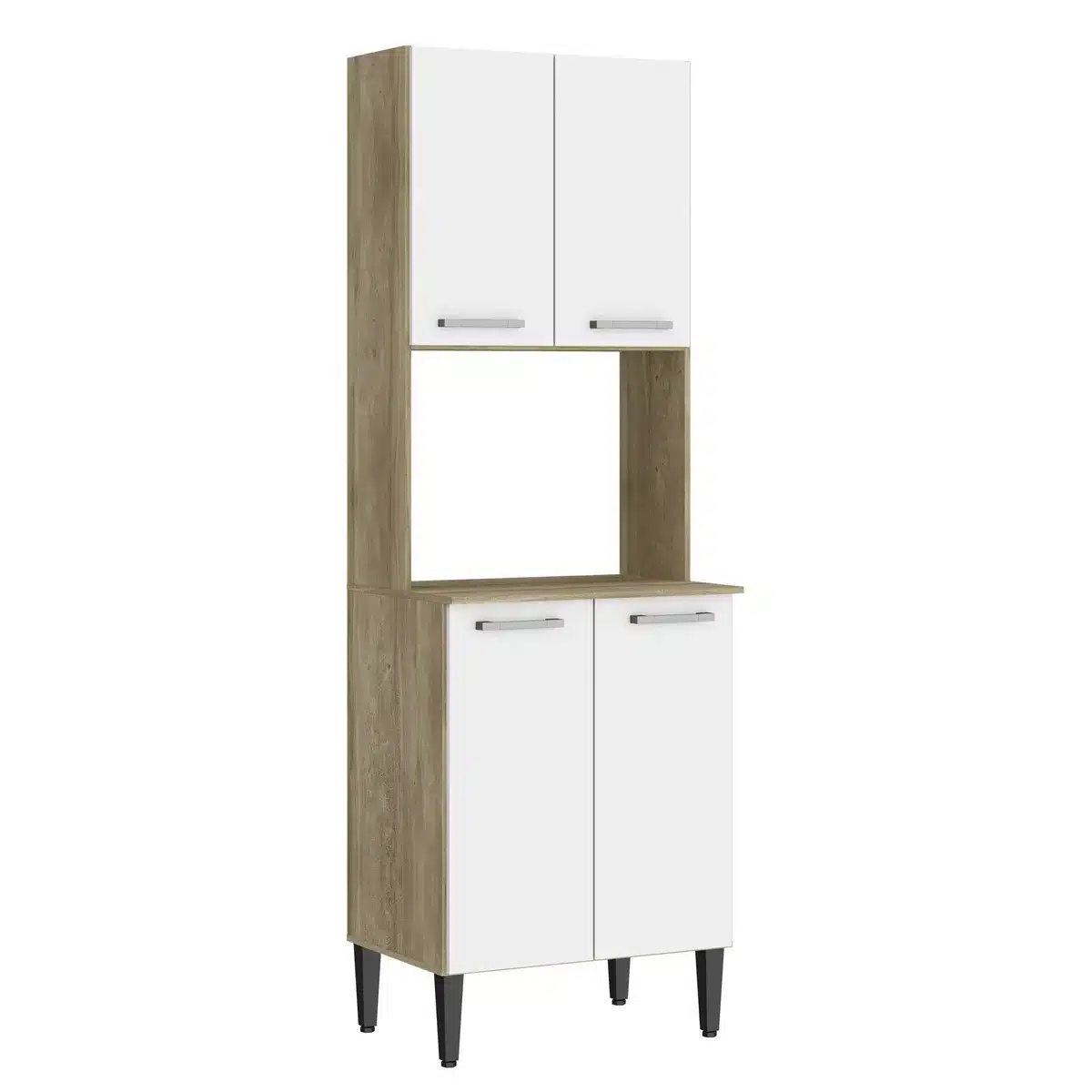 העיצוב המודרני והנקי של ארונית המטבח משלב קווים פשוטים וישרים עם שילוב צבעים דו-גוני אלגנטי – גוף בגוון אלון טבעי חם עם 4 דלתות לבנות נקיות וידיות מתכת – שמעניקים לארונית מראה מודרני, טרי ואלגנטי שמשתלב במטבחים מודרניים, סקנדינביים או קלאסיים. המבנה הגבוה (182 ס"מ) מנצל את גובה המטבח ומספק אחסון אנכי. 2 דלתות עליונות פותחות לתא עליון עם מדף, פתח אמצעי פתוח למיקרוגל, ו-2 דלתות תחתונות עם מדפים. הרגליים הפלסטיקיות בגובה 17 ס"מ מרימות את הארונית מהרצפה ומאפשרות ניקוי. הידיות המתכתיות מוסיפות נגיעה מודרנית.