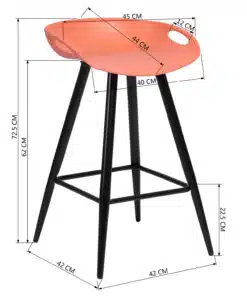 כסא בר עם משענת נמוכה בעיצוב מודרני בגוון כתום. הכסאות עשויים מפלסטיק קשיח ומסגרת מתכת אל חלד בצבע שחור.
