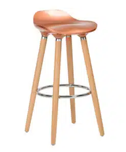 כסאות בר למטבח או לבר הביתי בעיצוב חדשני ומדליק . עשויים מפולימר סינתטי אמורפי תרמופלסטי איכותי עמיד וקל לניקוי. בצבע אפרסק – רוז בגוון זהב. רגיל הכיסא עשויים מעץ ובסיס כום למשענת הרגליים.