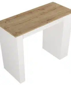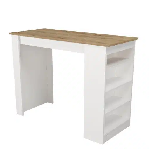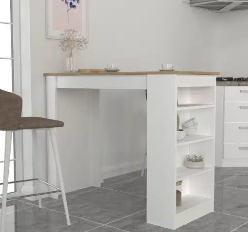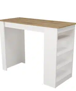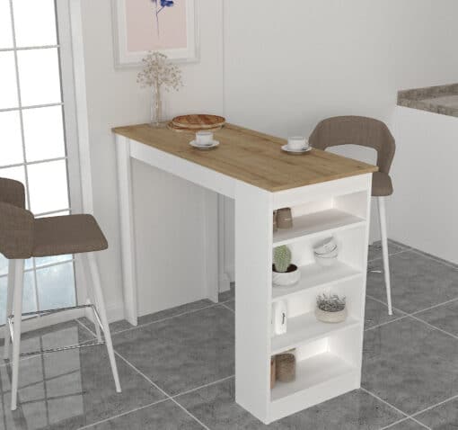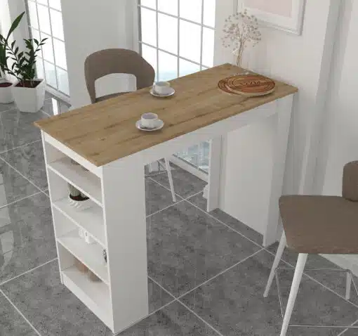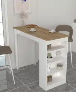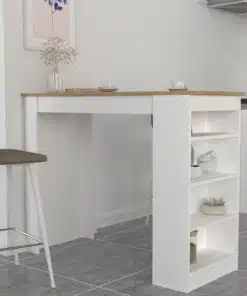 שולחן הבר שלנו, המשלב בין לבן קלאסי לחום עץ טבעי, הוא הפתרון המושלם. העיצוב המינימליסטי והאלגנטי, בשילוב עם מדפים מרווחים לאחסון, הופכים אותו לתוספת פרקטית ואסתטית לכל חלל.