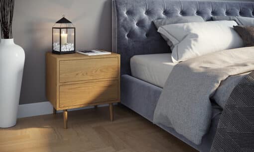 שידת צד מיטה בגוון עץ אלון עם שני מגירות גדולות ונוחות לאחסון ופתיחה נסתרת.