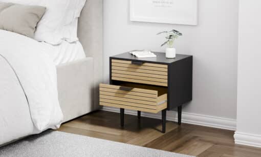 שידת צד יפהפייה בעיצוב נורדי, בעלת מראה יוקרתי ומלא סטייל. השידה עשויה מעץ מלא אלון, בגוון שחור משולב אלון טבעי. השידה בעלת שתי מגירות גדולות על מסילות שקטות, המספקות מקום רב לאחסון. המגירות מעוצבות בצורה נקייה וחלקה, המשתלב היטב עם העיצוב הכללי של השידה.