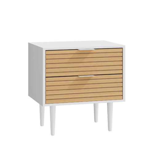 שידת לילה בעיצוב נורדי מודרני יוקרתי, בעלת מראה אלגנטי וקלאסי. השידה עשויה מעץ מלא, בשילוב של צבע לבן משולב אלון. השידה בעלת שתי מגירות גדולות על מסילות שקטות, המספקות מקום רב לאחסון. המגירות מגיעות בגוון מט עם פסי עץ אורן דקורטיביים, המוסיפים לשידה מראה ייחודי ויוקרתי.
