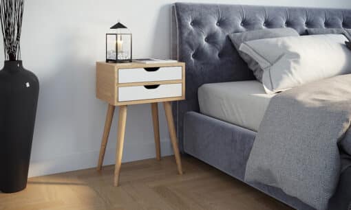 שידת צד מעוצבת לחדר השינה בגוון עץ אלון משולב עם לבן . עשויה מעץ מתועש עם חיפוי מלמין יצוק.