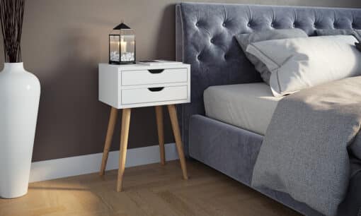 שידת צד לבנה לחדר שינה עם רגליים בגוון עץ בהיר. השידה עשויה מעץ מתועש עם חיפוי מלמין יצוק.