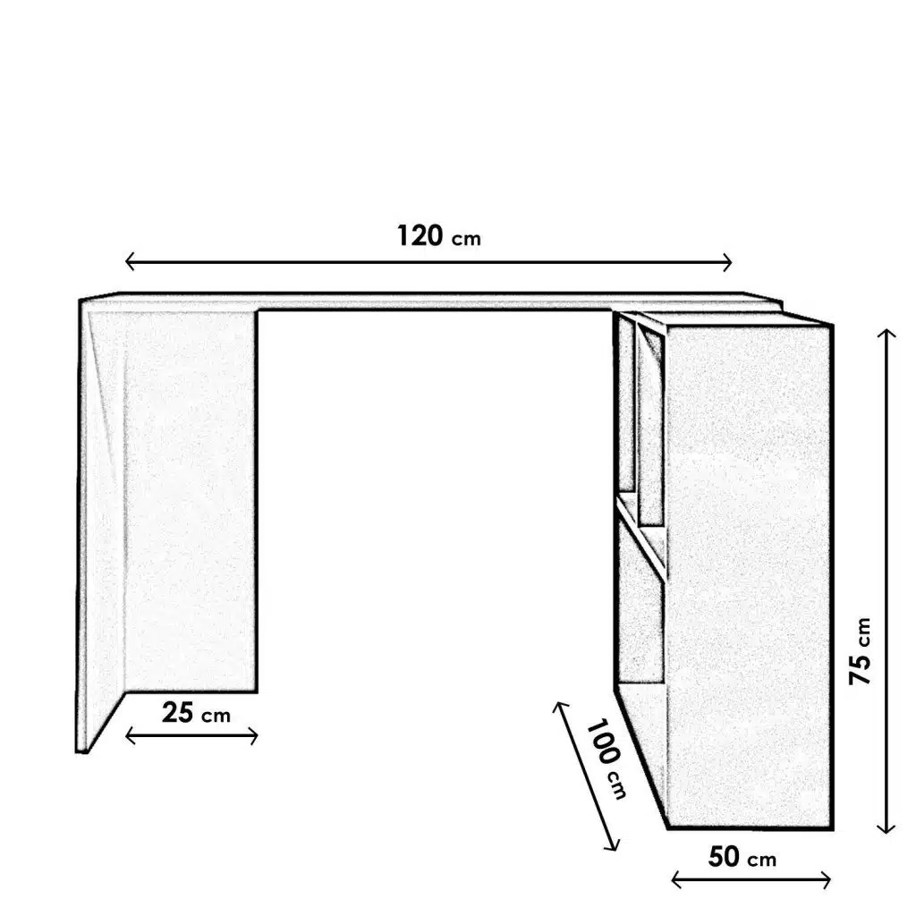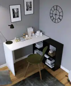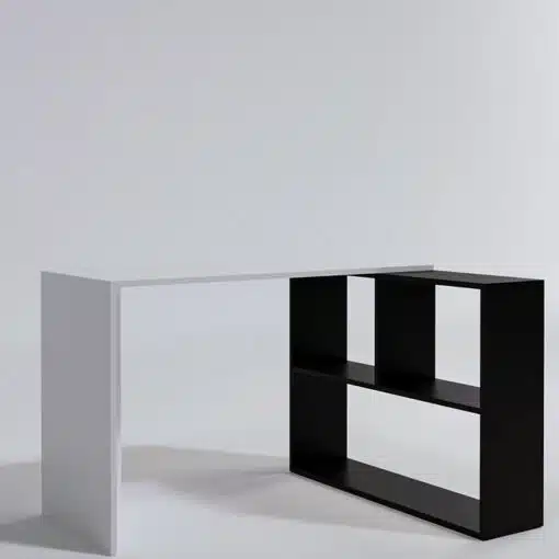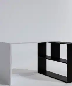 שולחן מחשב שחור לבן עם ספריית מדפים . השולחן עשוי משבבית דחוסה עם חיפוי מלמין איכותי בתו תקן אירופאי.