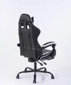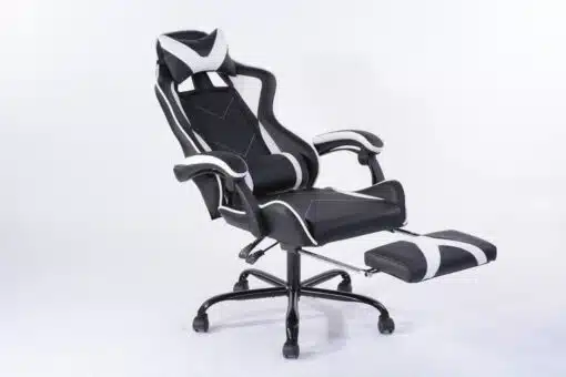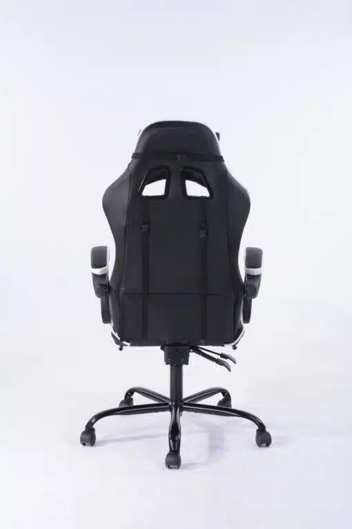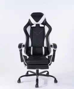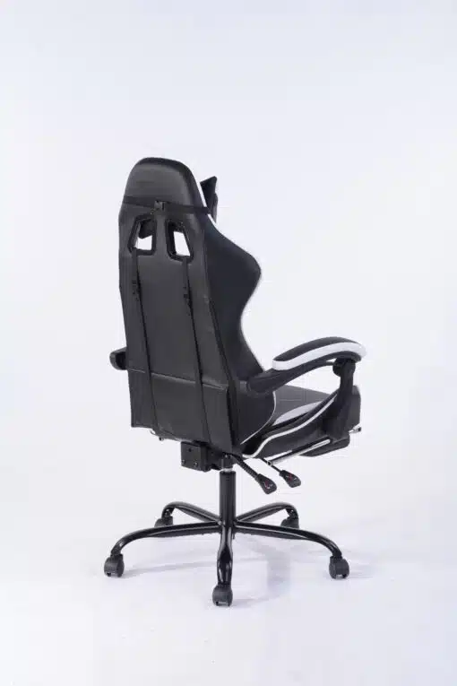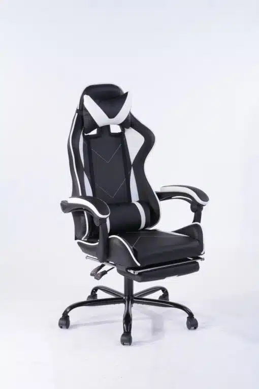 כיסא גיימניג שחור לבן מרופד היטב בספוג איכותי ודמוי עור איכותי עמיד. הכיסא ארגונומי ומעוצב לישיבה ממושכת , לכיסא יש מנגנון להתאמת גובה המושב , משענת הגב גם מתכווננת וניתן לקבע אותה בזויות שונות. הכיסא מגיע עם שני כריות נוחות לצוואר ולגב התחתון, ומשענת רגליים מתכווננת, משענות הידיים מתכווננות יחד עם משענת הגב.