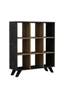 כוורת אחסון 9 תאים מעוצבת לסלון בגוון עץ משולב עם גוון שיש שחור עם גידים. הכוורת עשויה מעץ מתועש עם חיפוי מלמין יצוק.