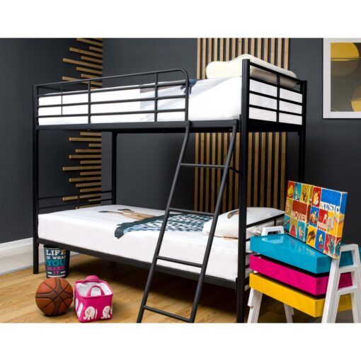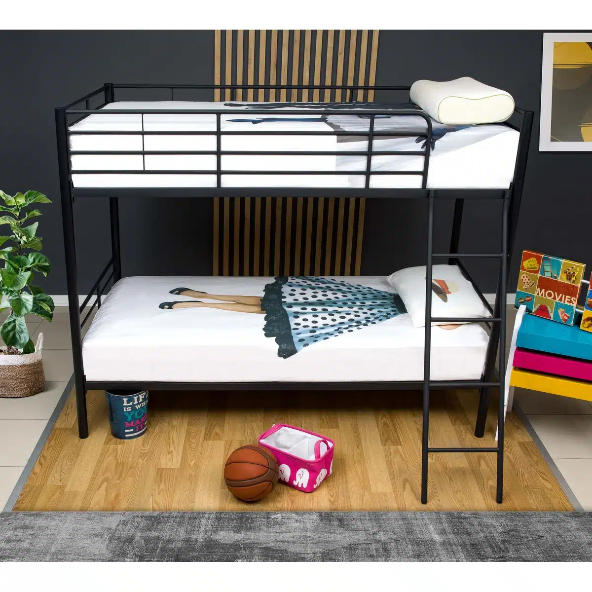 מיטת קומתיים ממתכת בצבע שחור עשויה ממתכת אל חלד חזקה ויציבה צבועה בצביעה אלקטרוסטטית איכותית. המיטה העליונה מאובזרת במעקה בטיחות להגנת ילדכם.
