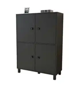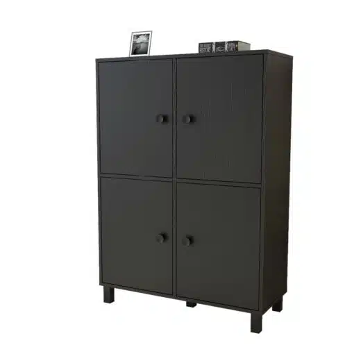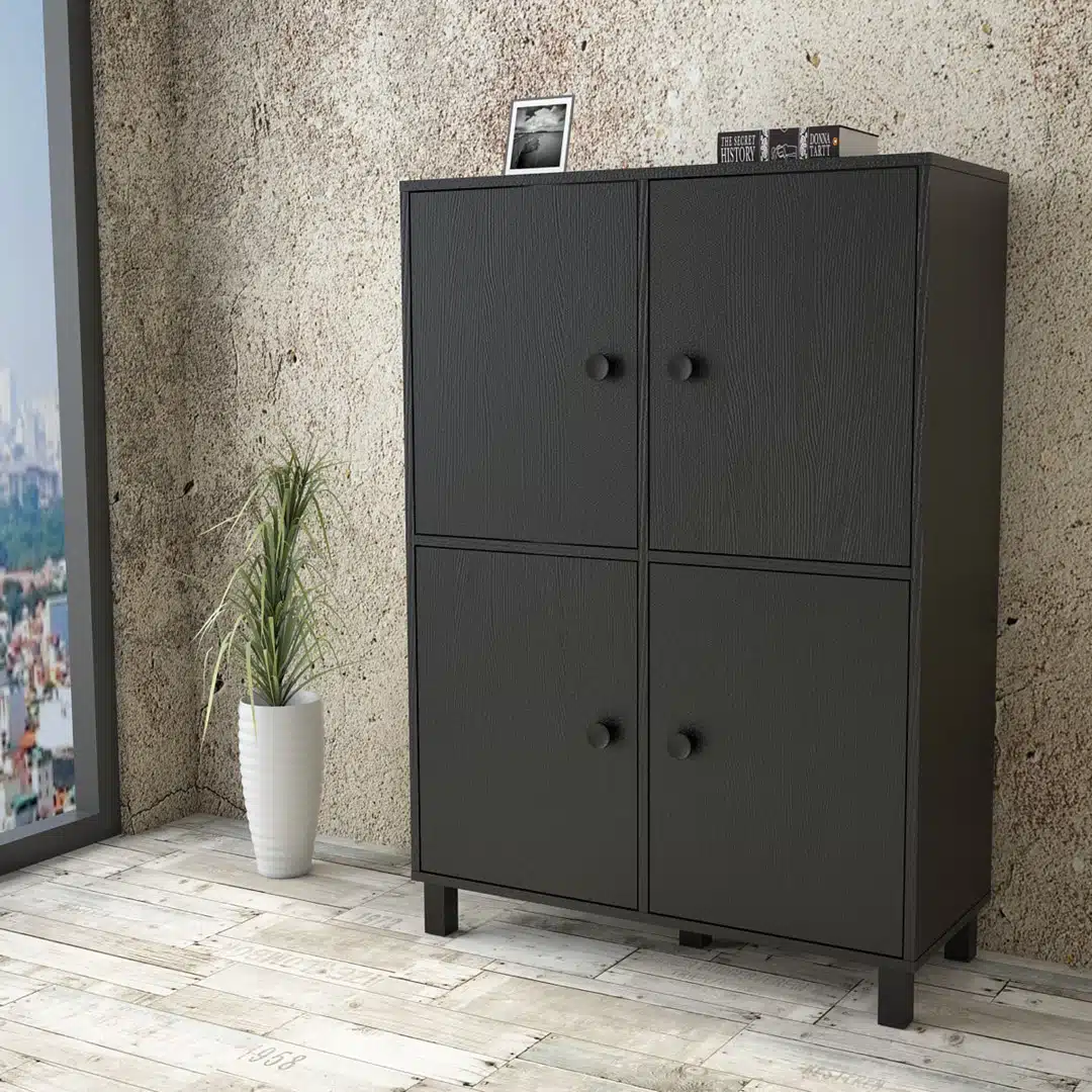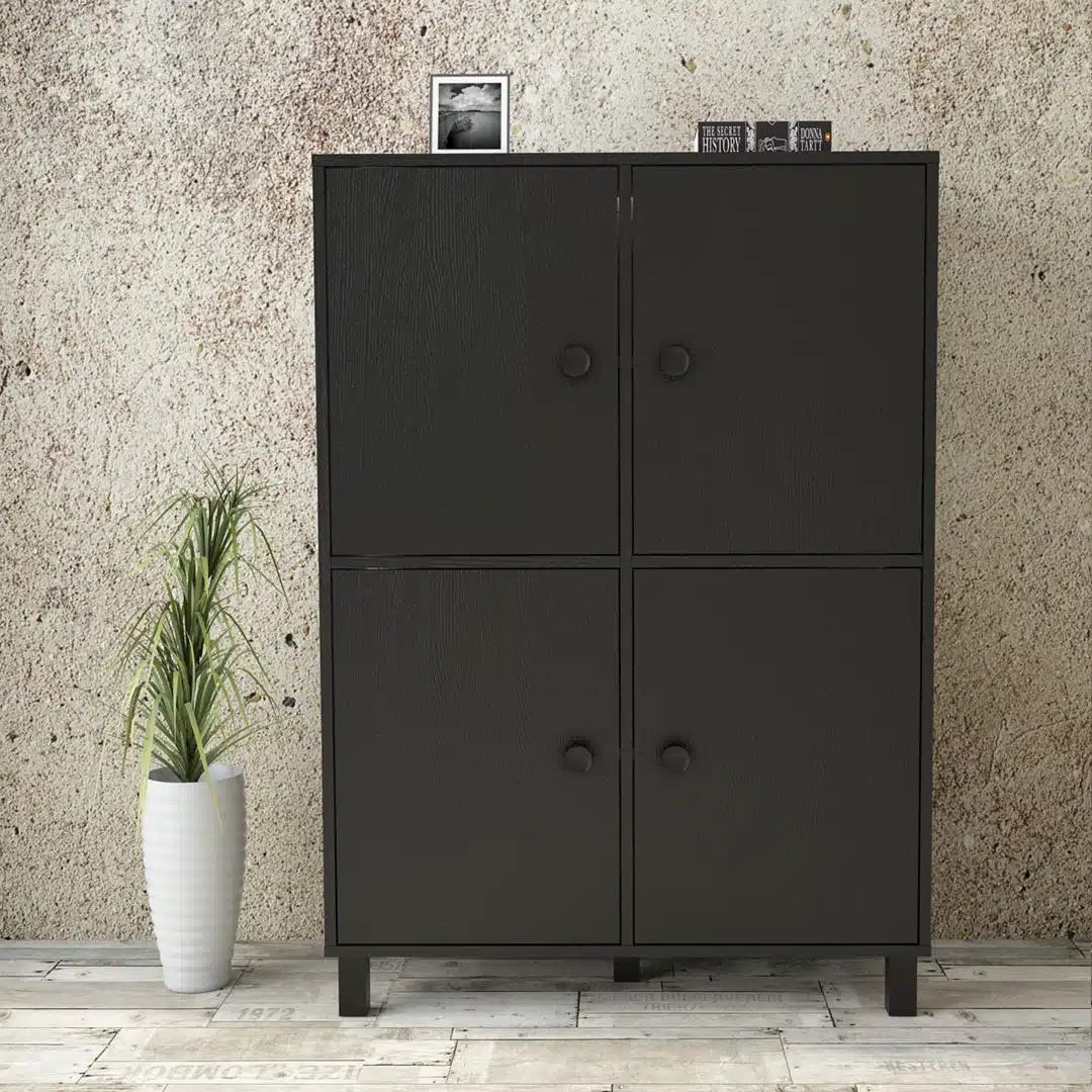 ארון בצבע שחור עם 4 דלתות מחולק למדפים גדולים ונוחים לאחסון . מתאים לחדר השינה , לסלון או למשרד.