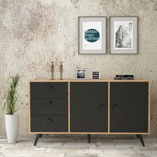 קונסולה שחורה לכניסה לבית או לחדר השינה בעיצוב קלאסי עם מדפי אחסון מגירות . הקומודה עשויה מעץ מתועש עם חיפוי מלמין יצוק