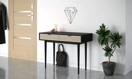 שולחן קונסולה בצבע שחור לכניסה לבית עם שני מגירות אחסון , עשויה מעץ מתועש עם חיפוי מלמין יצוק.