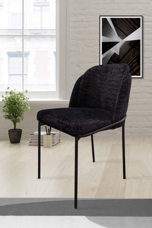 כסא לפינת אוכל בגוון שחור מבד איכותי עמיד ונעים למגע. הכיסא מרופד היטב בספוג איכותי ועמיד , מסגרת הכסאות עשויה ממתכת אל חלד בצבע שחור בצביעה אלקטרוסטטית איכותית ועמידה.