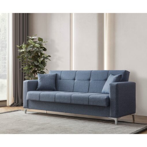 ספה תלת מושבית נפתחת למיטה מרופדת בבד כחול  איכותי עמיד וקל לניקוי, הספה נוחה מאוד לישיבה ושינה מרופדת בספוג איכותי בצפיפות גובה בדרגות קושי שונות מאובזרת עם מערכת קפיצים איכותית ועמידה.