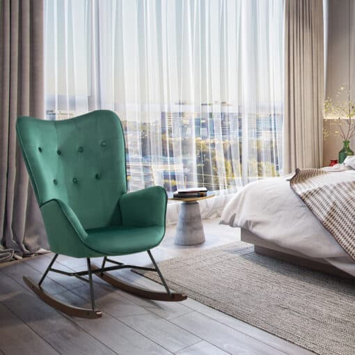 כסא נדנדה מושלם להנקה בבד קטיפה ירוק איכותי ונעים למגע, הכיסא מרופד היטב בספוג איכותי בצפיפות גובה ומסגרת מתכת ועץ מלא.