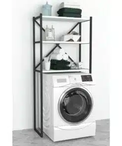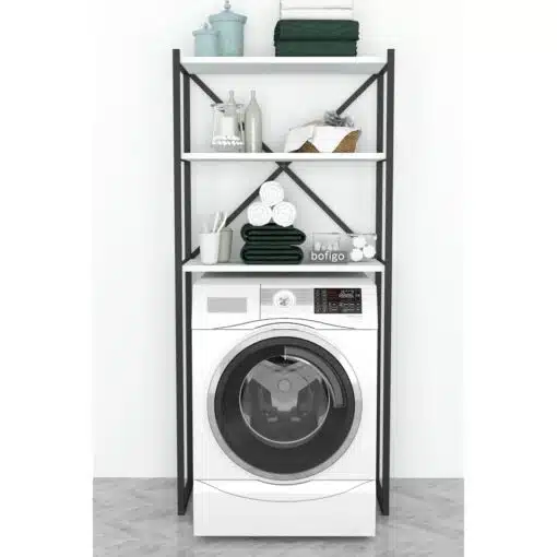 ארון מדפים פתוח למכונת כביסה מכיל שלושה מדפים לאחסון עשוי מעץ מתועש עם חיפוי מלמין יצוק בצבע לבן , מסגרת הארון עשויה ממתכת אל חלד בצבע שחור.