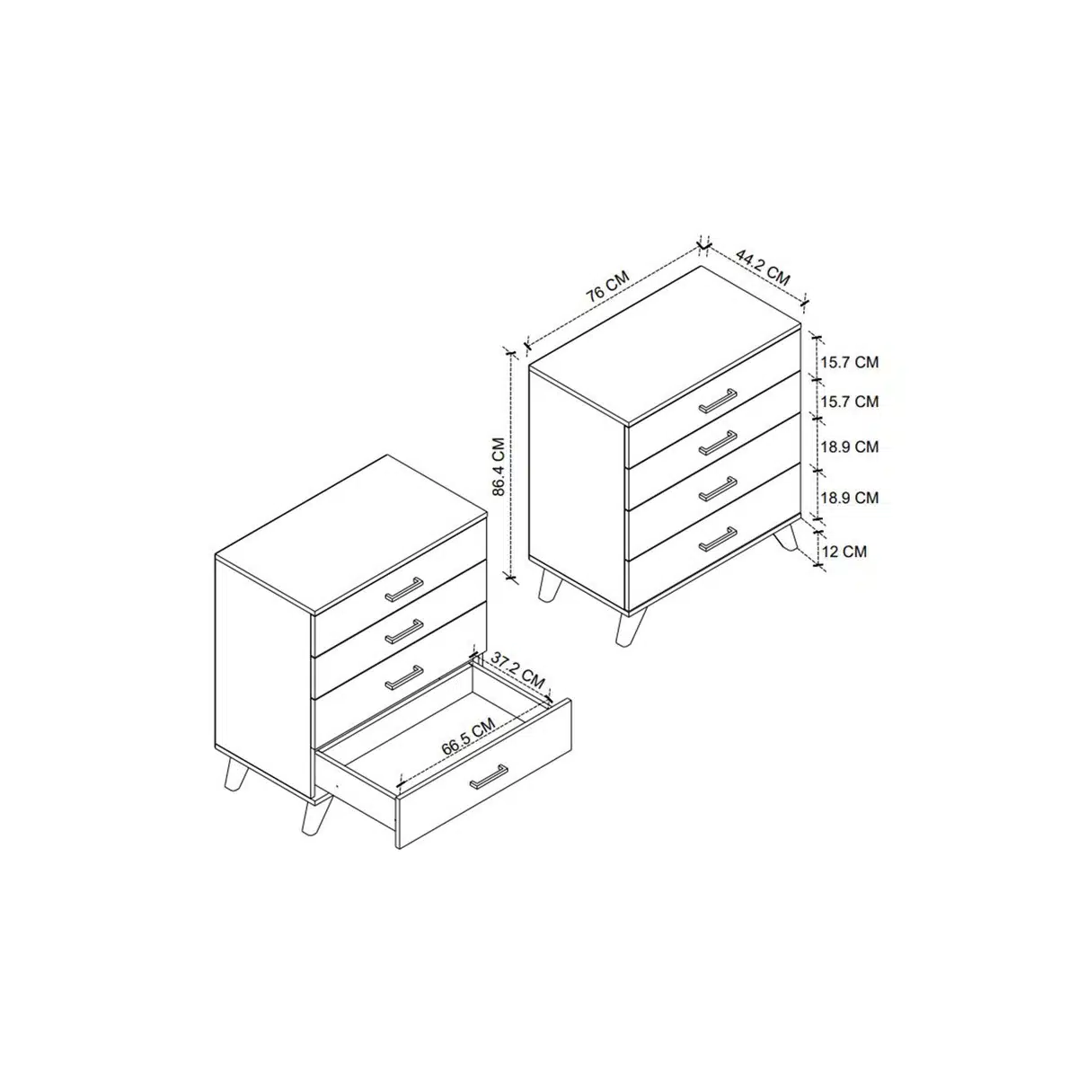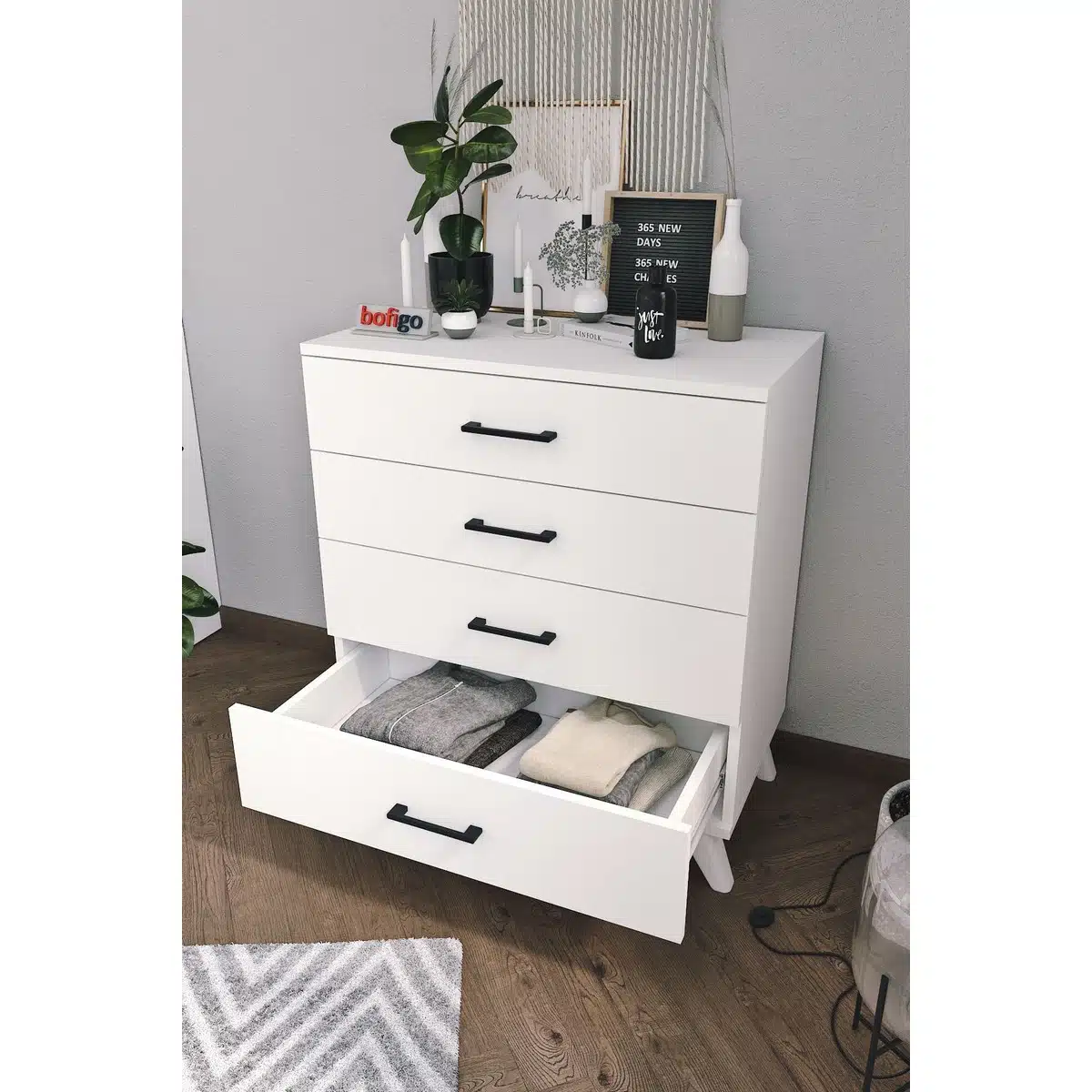 שידת מגירות לבנה לחדר השינה בעלת 4 מגירות גדולות ונוחות לאחסון. השידה עשויה מעץ מתועש עם חיפוי מלמין יצוק. המגירות מאובזרות עם מסילות טלסקופיות איכותיות. רגלי השידה עשויים מפי.וי.סי