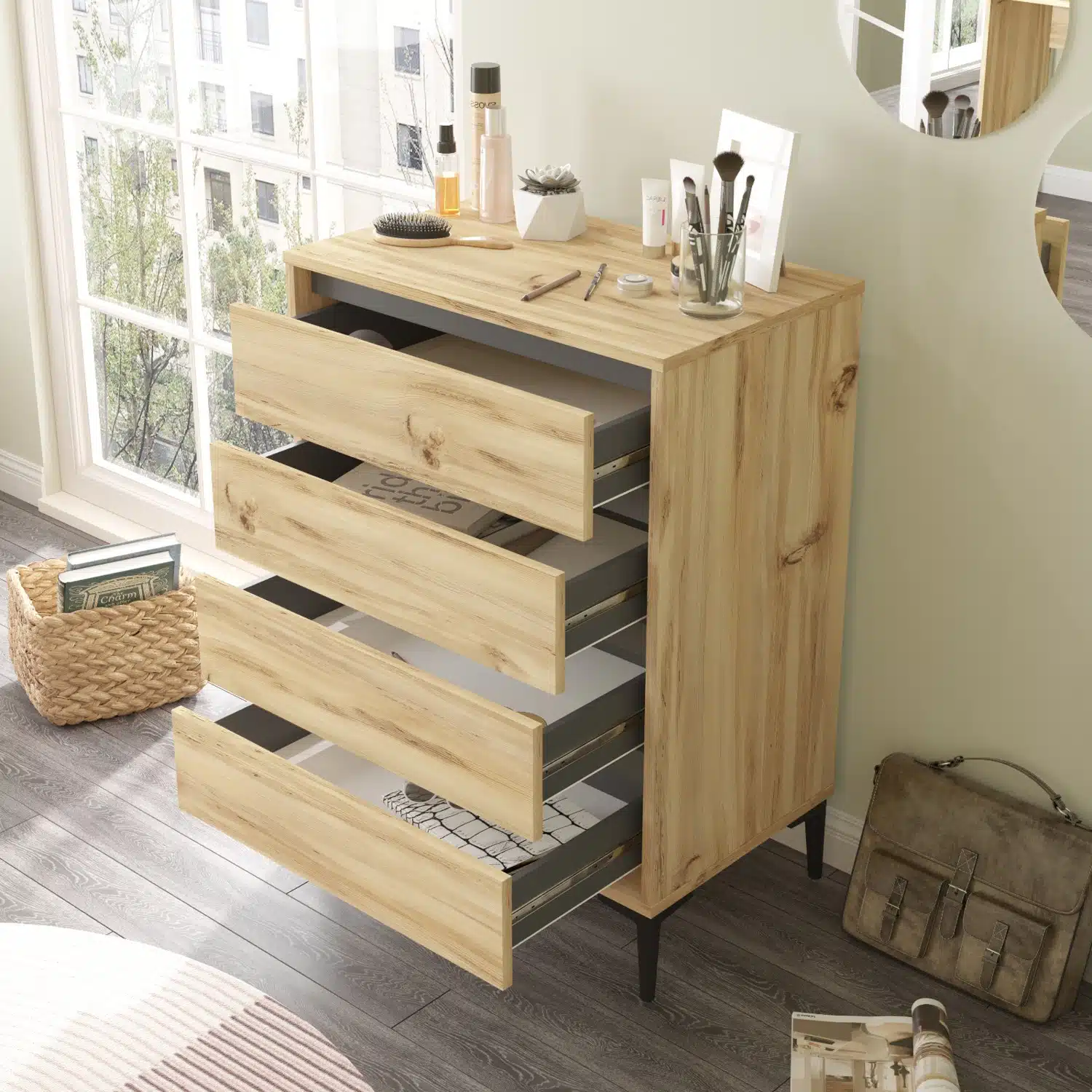 שידת מגירות מעץ לחדר השינה עם 4 מגירות גדולות ונוחות לאחסון רב תכליתי. שידה זו עשויה מעץ מתועש עם חיפוי מלמין יצוק בגוון אלון.