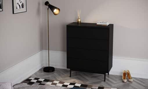 קומודה עם 4 מגירות לחדר השינה בצבע שחור עשויה מעץ מתועש עם חיפוי מלמין . מסילות טלסקופיות להנעת המגירות בקלות ונוחות.