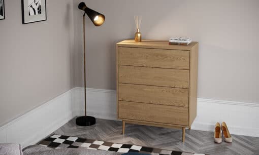 קומודה מעוצבת זו מציגה את יופיו הנצחי של גוון האלון הטבעי בעיצוב פרקטי ואלגנטי. עם ארבע מגירות גדולות וגובה מרשים של 100 ס"מ, הקומודה מספקת פתרון אחסון מקסימלי לחדר השינה תוך שמירה על מראה חם ומזמין.