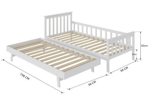 מיטת ילדים מעץ אורן עם מיטת חבר נפתחת היא בחירה מעולה לילדים בכל הגילאים. המיטה עשויה מעץ מלא חזק עם גימור בצבע לבן, המעניק לה מראה אלגנטי ועדכני. ראש המיטה עשוי עץ אורן חזק באיכות גבוהה, והרגליים חזקות ויציבות לאורך זמן. מיטת החבר נעה על גלגלים ומתרוממת לאותו גובה של המיטה הראשית, כך שתוכלו להשתמש בה כמיטה נוספת . רגליי מיטת החבר מתקפלות באמצעות מנגנון קפיץ חזק הן לבטיחות ולפתיחה מהירה וקלילה.