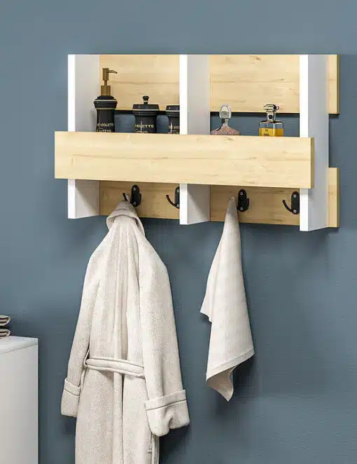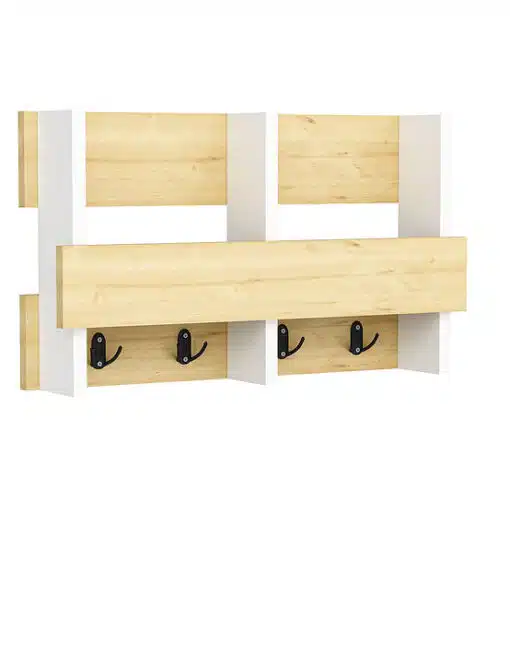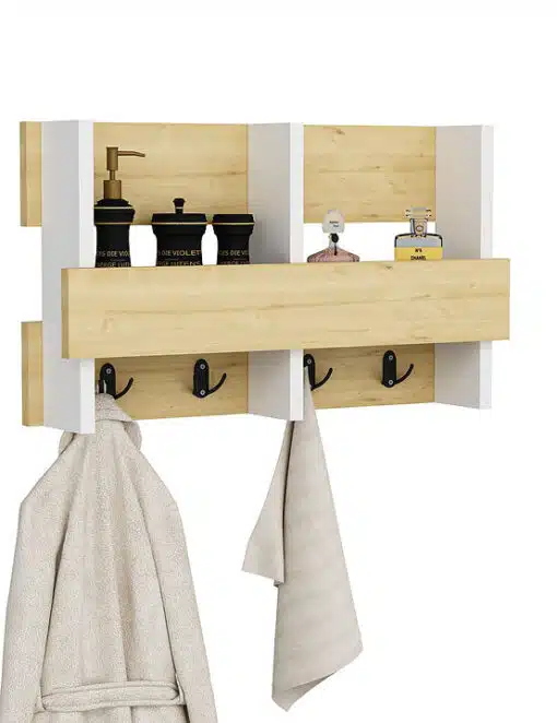 מתלה מעילים לכניסה לבית לחדר שינה או לאמבטיה עם 4 ווים כפולים לתלייה ומדף לאחסון או נוי. המדף עשוי משבבית דחוסה עם חיפוי מלמין יצוק.
