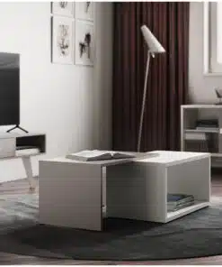 שולחן קפה עם תא אחסון מודולרי . השולחן עשוי משבבית דחוסה עם חיפוי מלמין בגוונים לבן ובז'