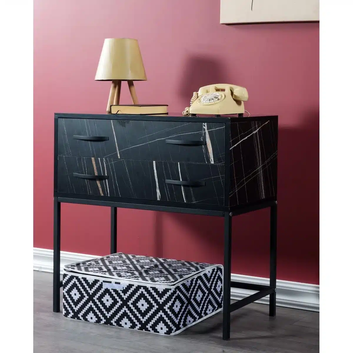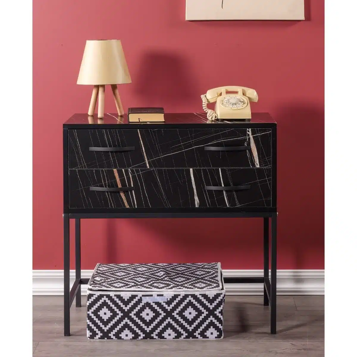 קונסולת כניסה מעוצבת ברוחב 80 ס"מ עם עיצוב שיש שחור יוקרתי – הפתרון המושלם לכניסה מרשימה. הקונסולה כוללת 2 מגירות נשלפות, משטח רחב ובסיס מתכת חזק.