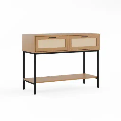 הקונסולה מספקת חוויית שימוש נוחה ופרקטית עם שתי מגירות מרווחות בעיצוב ראטן יוקרתי לאחסון מפתחות, ארנק, משקפי שמש ופריטים אישיים קטנים. המשטח העליון הרחב מאפשר הצבת אביזרי דקורציה, צמחים, מנורות או מגשי קישוט, והמדף התחתון מספק מקום נוסף להנחת תיקים, נעליים או פריטים גדולים יותר.