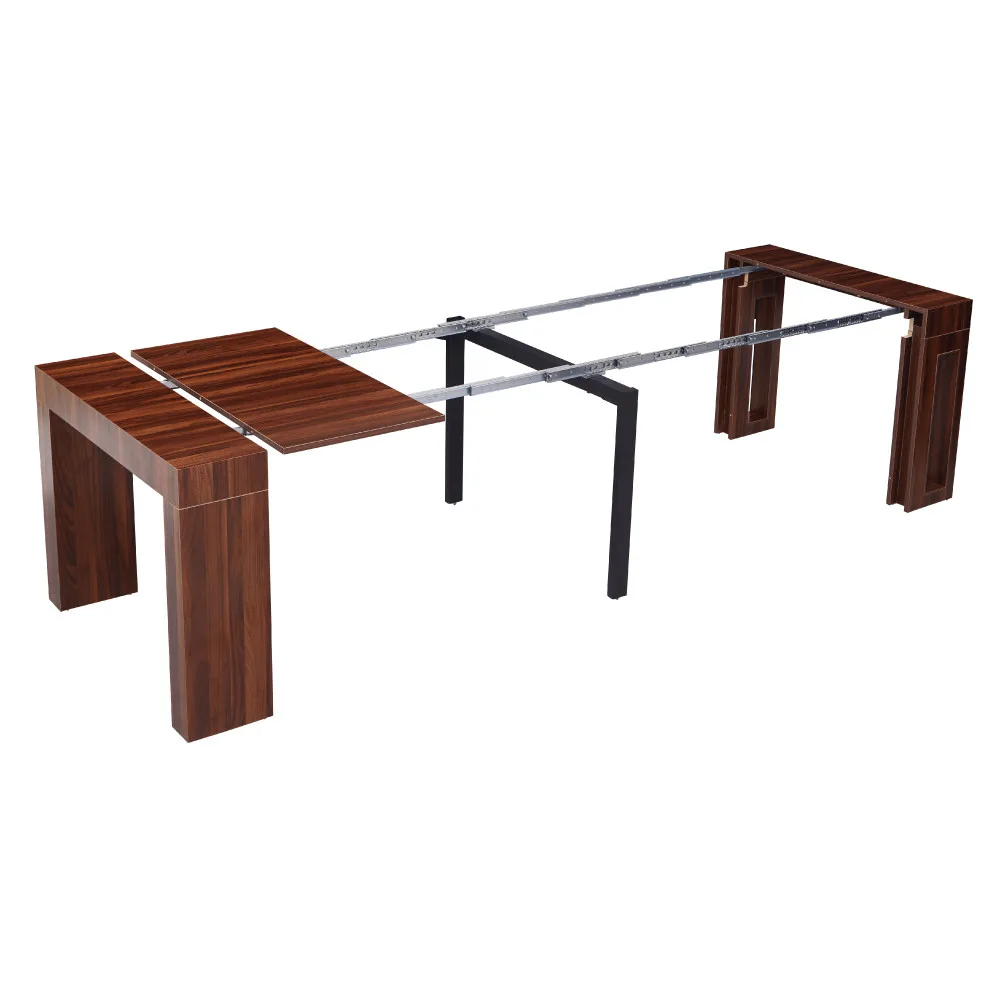 היתרון המרכזי של הקונסולה הוא מנגנון הפתיחה הייחודי בעל 5 פתיחות עצמאיות. אתם לא חייבים לפתוח את השולחן עד הסוף – ניתן לעצור בכל שלב לפי מספר האורחים וגודל החלל הזמין. בין כל פתיחה לפתיחה קיים מנגנון נעילה מובנה המבטיח יציבות מקסימלית בכל מצב פתיחה. מסילות הפלדה החזקות מאפשרות פתיחה חלקה וקלה, והרגל האמצעית המצוידת בגלגל מקלה על התמרון והניידות.