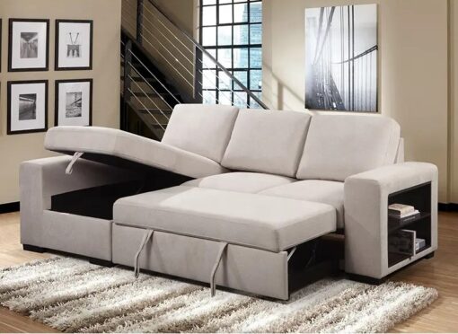 ספה פינתית נפתחת למיטה זוגית עם ארגז מצעים בבד בז'
