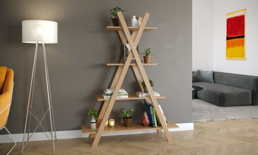 ספרייה מעוצבת לסלון עשויה מעץ מתועש עם חיפוי מלמין יצוק.