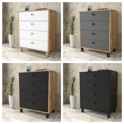 קומודה מגירות מעוצבת בארבעה צבעים – פתרון אחסון אלגנטי לכל בית