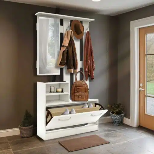 הפכו את כניסת הבית שלכם למרחב מסודר ומעוצב עם ארון הכניסה הרב-תכליתי שלנו. פתרון עיצובי חכם המשלב בתוכו מראה מלאה, אחסון נעליים, מדפי אחסון ותליינים – הכל במוצר אחד קומפקטי ואלגנטי.