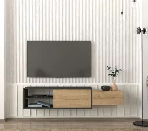 המזנון הצף שלנו הוא הבחירה המושלמת עבורך! שילוב מנצח של עץ אלון חם ואפור כהה יוצר מראה טבעי ואלגנטי שיתאים לכל סגנון עיצוב.