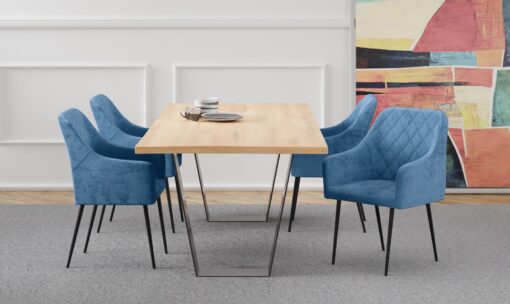 כיסא פינת אוכל מרופד בבד קטיפתי בגוון תכלת- טורקיז. הכיסא מרופד היטב בספוג איכותי בצפיפות גובה , משענת הגב מעוצבת בתפירת מעויינים. מסגרת ורגלי הכסא עשויות מתכת אל חלד חזקה ויציבה בצבע שחור