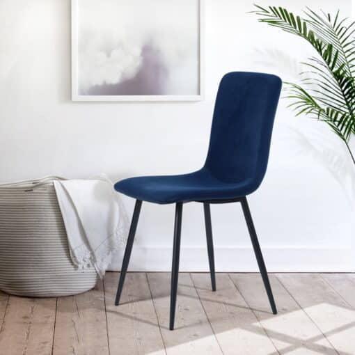 כסאות מעוצבים לפינת אוכל בבד קטיפה בצבע כחול עמוק. הכסאות מרופדים בספוג איכותי בצפיפות גבוה , רגלי הכסאות עשויות מתכת אל חלד בצבע שחור.