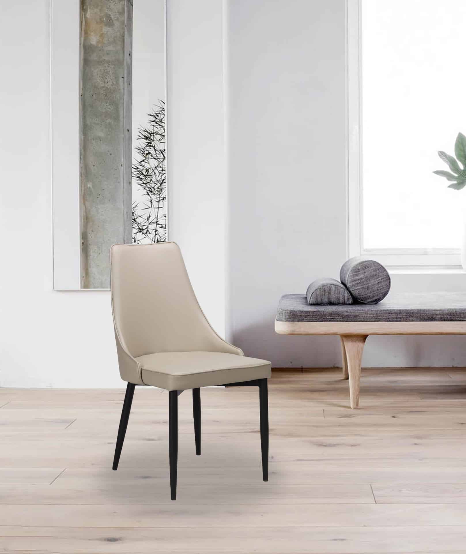 כסאות פינת אוכל איכותיים מרופדים בדמוי עור איכותי עמיד וקל לניקוי בגוון אבן, הכסאות מרופדים בספוג איכותי בצפיפות גבוה , מסגרת הכסאות עשויה מתכת אל חלד בצבע שחור.